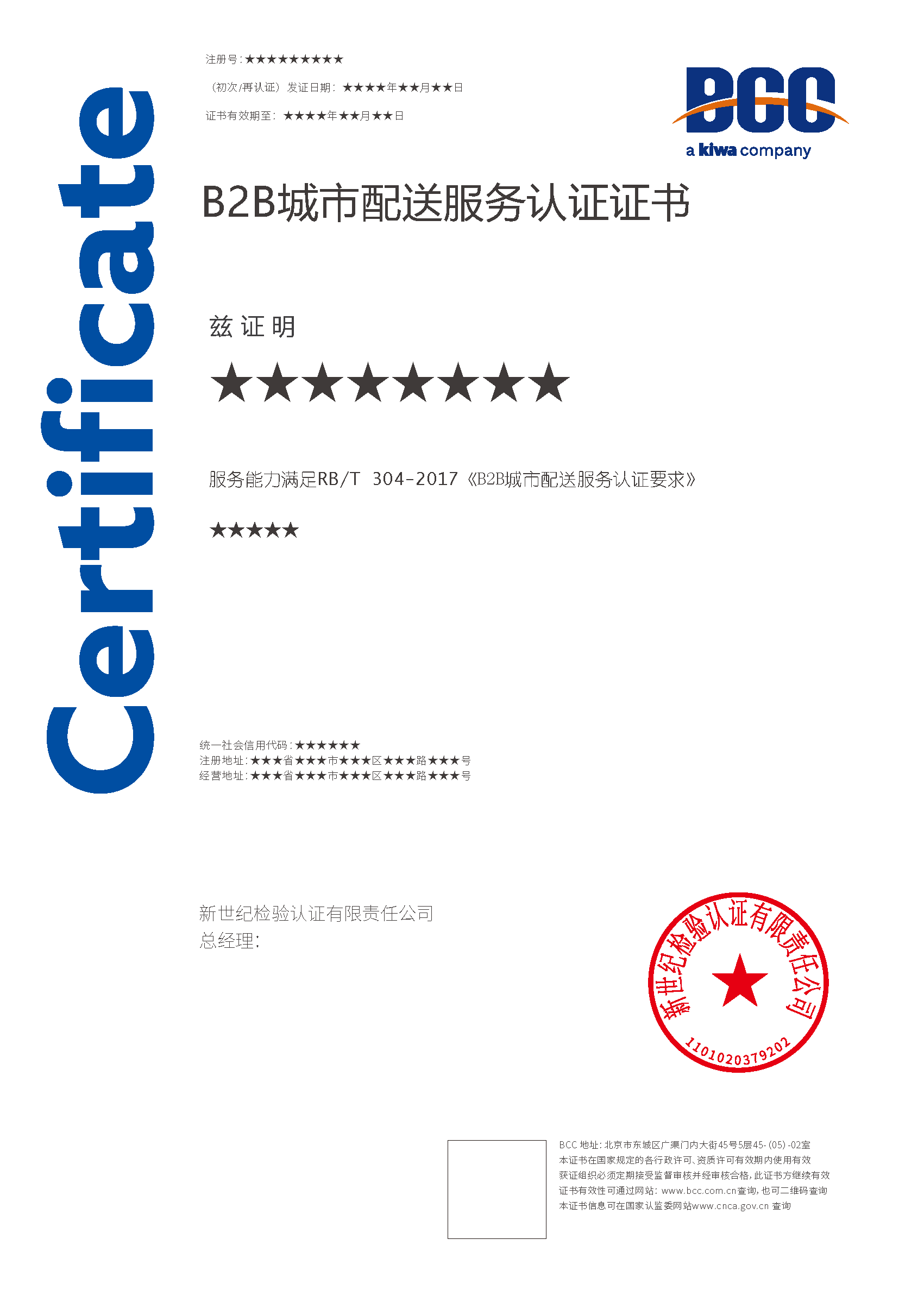 認(rèn)證適用于相關(guān)的B2B城市配送服務(wù),但不包括:危險化學(xué)品、冷鏈?zhǔn)称?物品、以及專賣商品等特殊要求的配送服務(wù)。