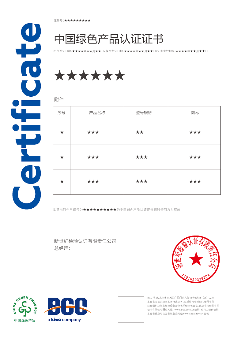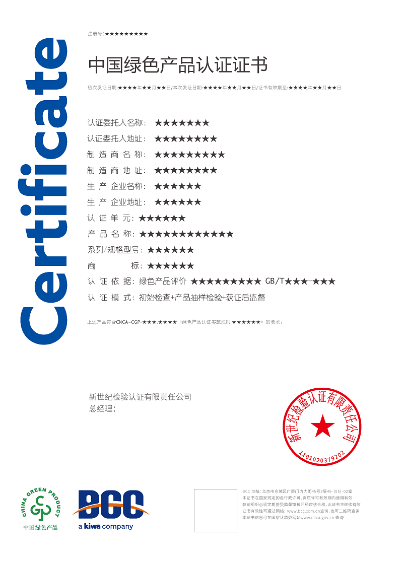 目前,BCC已順利通過國(guó)家認(rèn)證認(rèn)可監(jiān)督管理委員會(huì)(CNCA)審批,獲得了多項(xiàng)綠色產(chǎn)品認(rèn)證資質(zhì),包括: