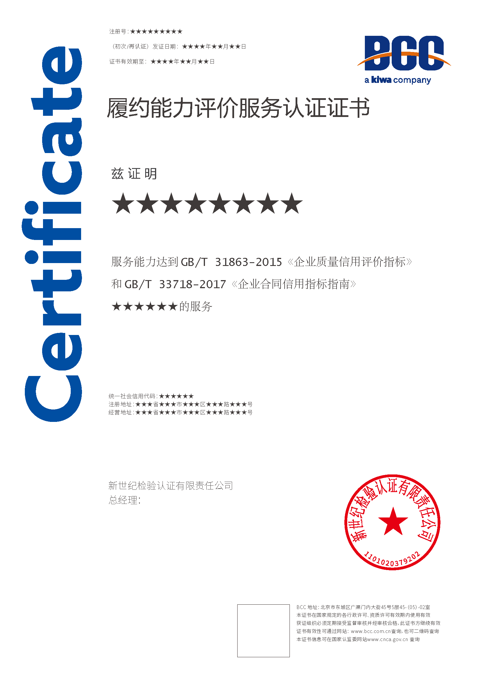 本頁涉及的認證服務中均有對應的《認證實施規(guī)則》,BCC擁有其最終解釋權。任何組織及個人未經BCC許可,不得以任何形式全部或部分使用(法律要求除外)認證相關信息。如需獲取相關實施規(guī)則請用以下方式聯系獲?。弘娫挘?10-58579316 郵箱:fwjs@kiwa.cn